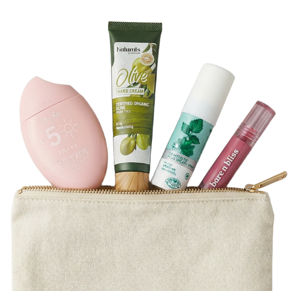 - Slip your sunscreen, hand cream, lip tint, and breath spray into the travel pouch for quick access.
