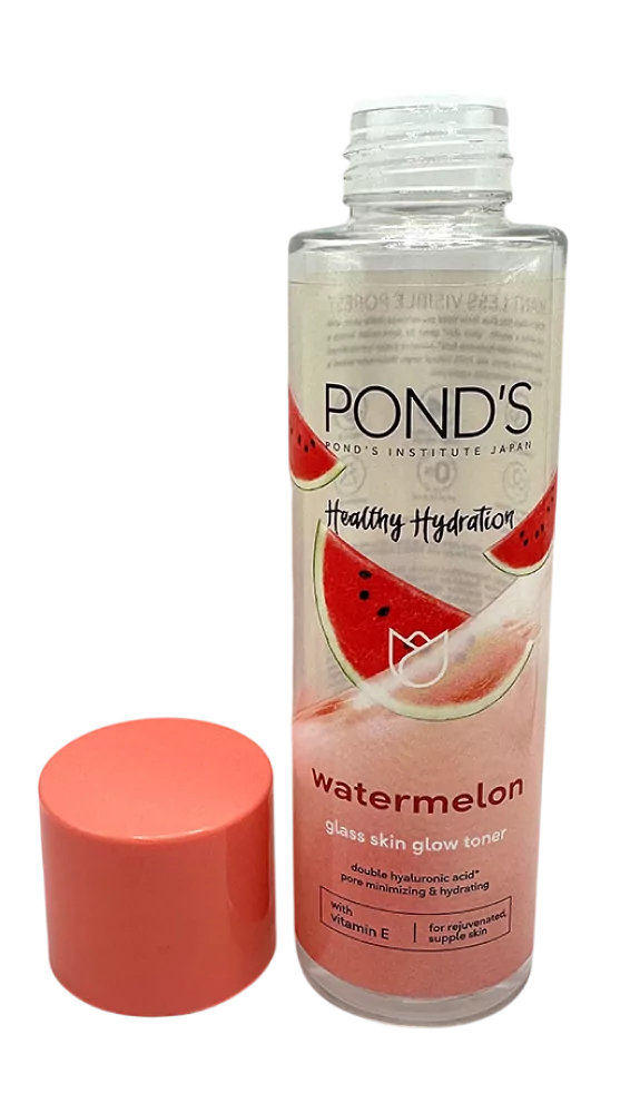 Pond's Watermelon Hydrating Toner bottle with pink cap removed, showing watermelon-themed label.